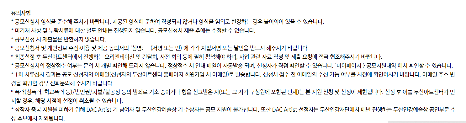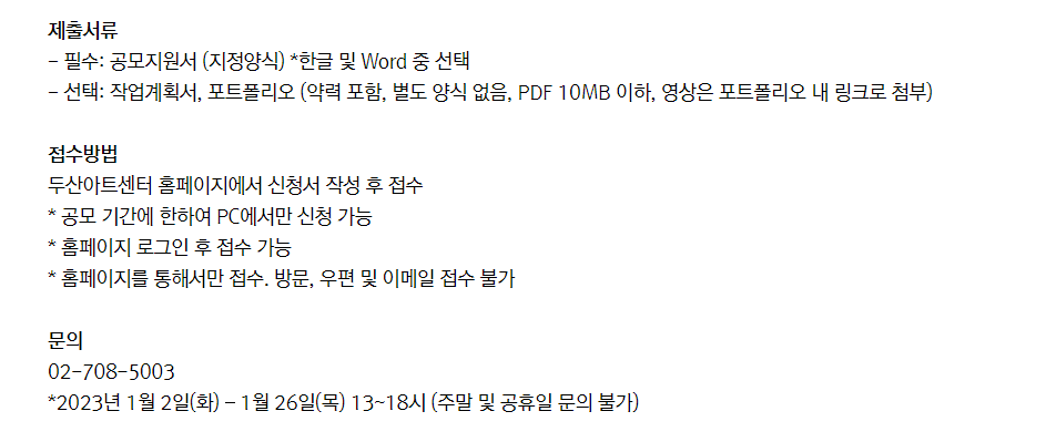 * 서류심사 통과하신 분에 한해 인터뷰 장소와 일정을 개별적으로 안내해 드리며, 인터뷰 관련 세부 사항은 두산아트센터와 협의를 통해 결정됩니다.